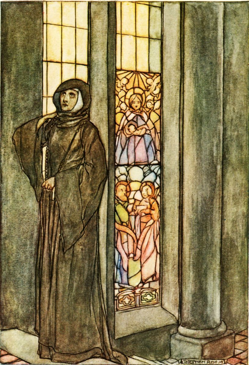 At length she came to a high wall wherein was a wicket gate, and through it she saw a garden full of sweet herbs and flowers, which surrounded a steep-roofed building of stone. In the garden she saw a man in a long brown robe tied about his waist with a cord. He smiled at her and beckoned her to come in without fear. He was a monk of Patrick, and the house was a convent church. When the monk had heard her tale, he marvelled greatly and brought her to St Patrick, who baptised her.