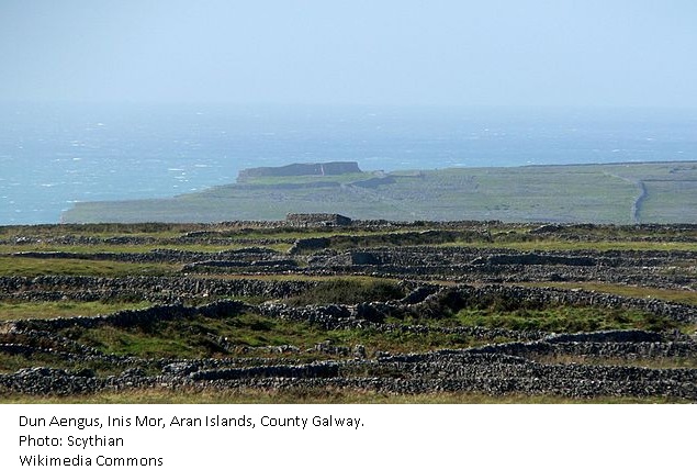 Each of the islands is rich in archaeological remains. Practically every kind of ancient structure, from the dolmen to the 17th Century castle, may be studied in Aran. The huge stone fortresses, which are so conspicuous landmarks as one approaches the islands from Galway Bay, testified to the importance of the islands in pagan times. From ecclesiastical remains and from the Annals, the role that Aran played in the history of the early Irish Church may be judged. There are four forts on the largest island, two on the second largest and one on the smallest. The most famous is Dun Aengus, which stands on a promontory at the edge of the sea. It was said it got its name from the dark colour of the stones of which it was built.
