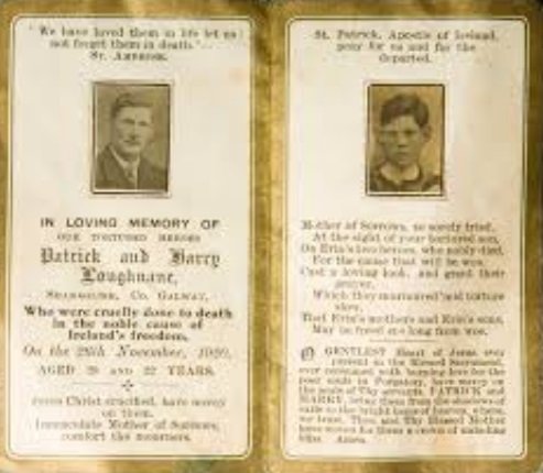 The brothers were members of the Volunteers, and were taken from home by the Black and Tans; their bodies being discovered in a pond some weeks later. Members of the I.R.A. from many districts, including many old comrades in the Volunteers, paraded to the spot, where they formed a guard of honour, and recited a decade of the Rosary in Irish.