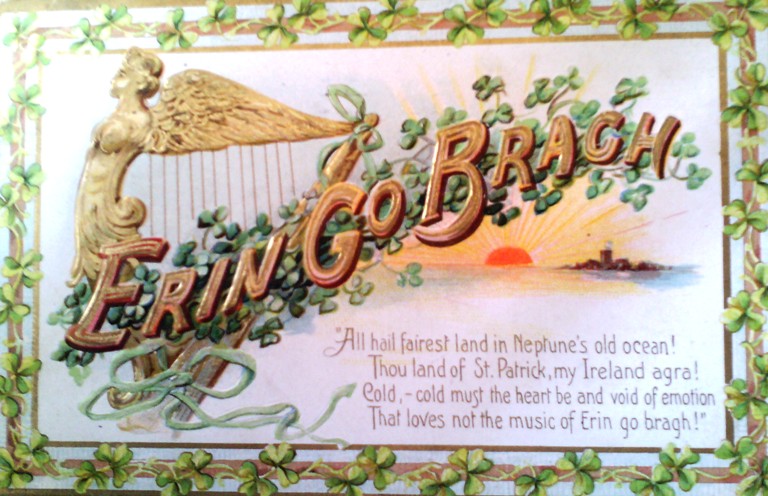 Was her modest blue eyes beaming ‘neath her ould plaid shawl.