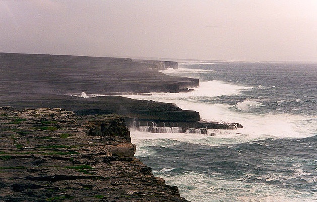 The method adopted at Arranmore, the largest of the islands of Arran off Galway Bay was different. When Mr R. Ball and I visited that island in July 1834 a rock climber – a tall athletic fellow – came up behind, unheard in his ‘pompootes’ . He was lowered over the loftiest limestone cliffs of the island, perhaps five hundred feet in height. His manner of descent was free and easy. He sat upon a stick, about a yard in length and two inches in thickness, to the middle of which one end of the rope was fastened, the other being held by men above.