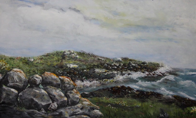 “Let us have tea first,” I mildly suggested. So we sat on the grassy fence and produced our tea pasket. Then we rose like giants refreshed, first giving the old man a cup of powerful tea to “cut the drouth.” We made for the nearest Galway wall, and patiently made a gap to get through, my conscientious friend building it up when we had got through. You see galway walls are made of large loose stones with the daylight visible through them; this is done purposely so that the wind can pass through them, an ordinary wall would offer too much resistance to the winds from sea and mountain which alternate and prevail in these parts. I have heard the “Galway Blazers,” when pursuing the crafty fox, take the fences at a flying leap, but I do not believe any one else could perform such a feat. Crossing the extensive field of “praties,” we came to the conclusion there was no church or ruin within two miles, so back we plodded, took down and re-built the wall again, but when this was repeated in a wheat field, and once more in a field of turnips my ardour began to abate and I even murmured “some other day perhaps.” Just then we heard a man’s voice, “If ’tis lookin’ for St. Colman’s Church, yez are all wrong. You’d never find it. Hould on a bit and I’ll show ye the way,” and putting the scythe with which he was at work against a wall, he told us to follow him. We coinjointly deprecated taking him from his work, but he replied with Irish politeness, “I am only working for myself so ’tis no odds.” Leading the way we followed through fields of tangled mountain grass and bog myrtle, through purple heather and rushes; it was slow work, as the growth hid the stones, which were truly a trap to the unwary. After slips and stumbles, we stopped to take breath in a hazel coppice; on emerging from thence our guide, pointing to the slop of the mountain, said “There it is before you now,” but it was some time ere we could distinguish the tiny grey ruined church from the back ground of the limestone rock.