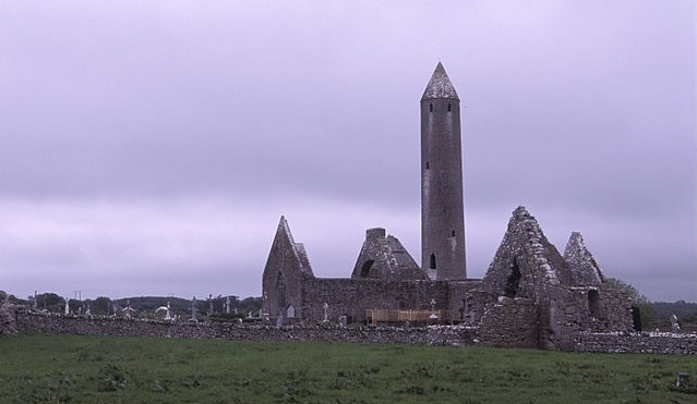 Kilmacduagh is a parish in the barony of Kiltartan, County Galway. The See of Kilmacduagh, now a part of that of Galway, was founded by St. Colman, who, being son of Duagh, was distinguished from other Colmans, his contemporaries, by the appellation of MacDuagh. He build a monastery and church called after him, Kilmac-Duagh, whence the name of the parish. The latter comprises 6,015 statute acres. Some ancient remains are to be seen in the neighbourhood, including a round tower, which declines about 17 feet from the perpendicular.